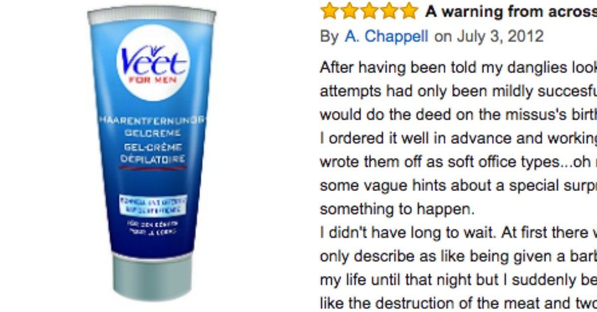 It’s not every day that you laugh about hair removal, but if you don’t after reading this stellar Amazon review for Veet for Men Hair Removal Creme, I’ll assume that you hate happiness.
